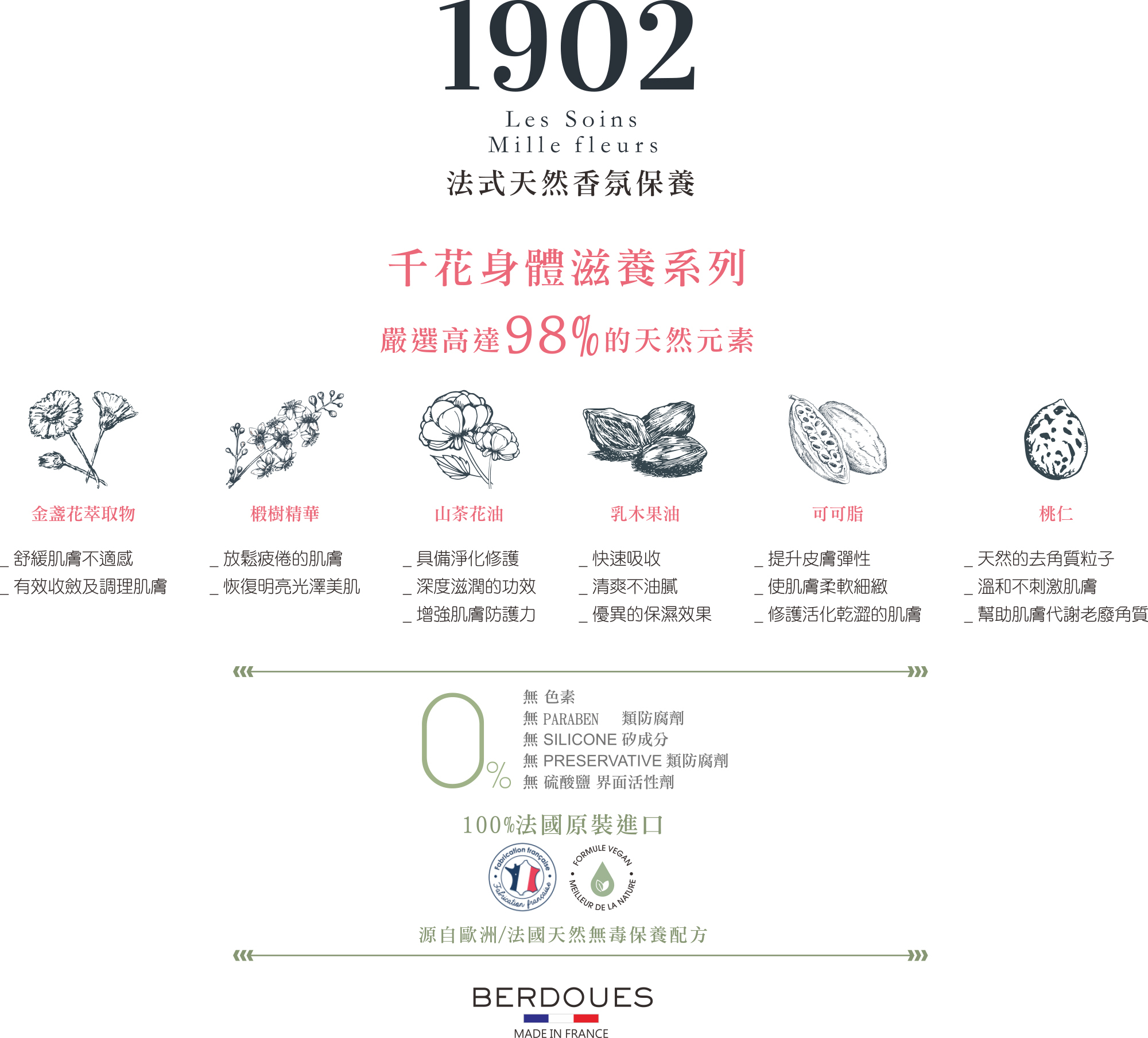 1902年系列的英文性Berdoues家對和化妝品充满熱情,於1902年創立了同名品牌。這是一個慷慨而真刻討香水,香水和護理品世界。