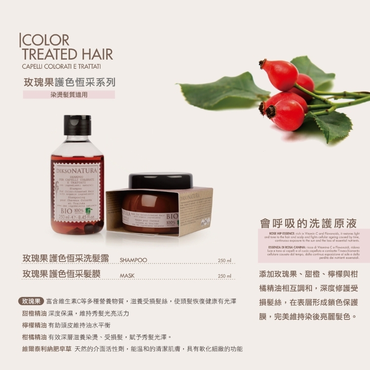 添加玫瑰果、甜橙、檸檬與柑橘精油相互調和,深度修護受損髮絲,並在表層形成鎖色保護膜,完美維持染後亮麗髮色。