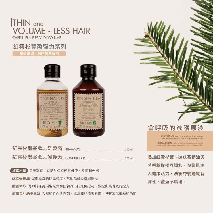 添加紅雲杉葉、迷迭香精油與茴香萃取相互調和,為髮肌注入健康活力,洗後秀髮蓬鬆有彈性,豐盈不扁塌。