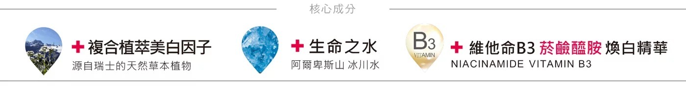 針對美白需求量身打造,富含多種高效美白成分幫助抑制黑色素沉澱及改善膚色不均,喚白提亮膚色並減少深色斑點及瑕疵。